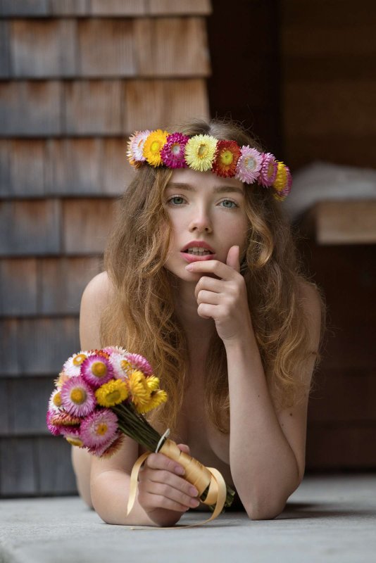 Украсив себя цветочным венком и эротично снимая с себя всю одежду, очаровательная деревенская красавица хвастается на камеру большой грудью и остальными выдающимися прелестями. Завлекая аппетитными формами потенциальных женихов, нежная милашка охотно демонстрирует себя во всей красе и интригующе засвечивает между бедрами маленькую гладкую писю.