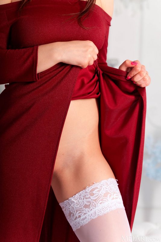 Уверенно держась перед камерой, роковая женщина в эротичных чулках возбуждающе медленно снимает с себя шикарное красное платье и выставляет на показ свое сексуальное тело с большими буферами и сладкой бритой пиздёнкой между развратно раздвинутыми упругими ягодицами.