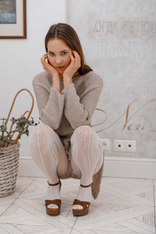 Девица с натуральными сиськами снимает колготки