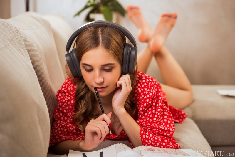 Соблазнительно изгибаясь на диване в разных позах, молодая детка с красивой упругой грудью медленно сняла с себя платье и без стеснения принялась демонстрировать нам свое стройное сексуальное тело, игриво выпячивая на камеру аппетитную попку и засвечивая между ног бритую писечку.