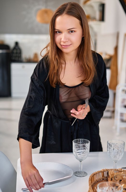 Хозяйничая на кухне и игриво красуясь перед камерой в своем откроенном наряде, аппетитная барышня развратно позирует в прозрачном платье и трусиках, а потом полностью оголяет свое сексуальное тело и приглашающе раздвигает ноги с бритой аккуратно писькой посередине.