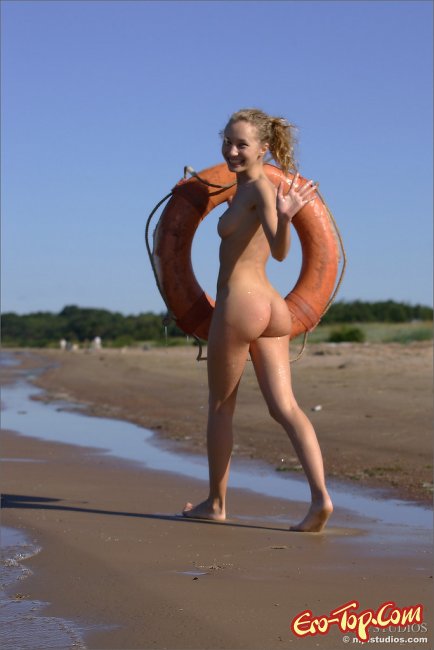 Молоденькая соска позирует на берегу большой речки со спасательным кругом. Голая сучка с великолепным худеньким телом, бегает по мокрому печку босиком. У жопастой телочки хорошее настроения, а еще у нее отличные сиськи с маленькими сосочками и узенькая пися с волосатым лобком, в виде треугольника.