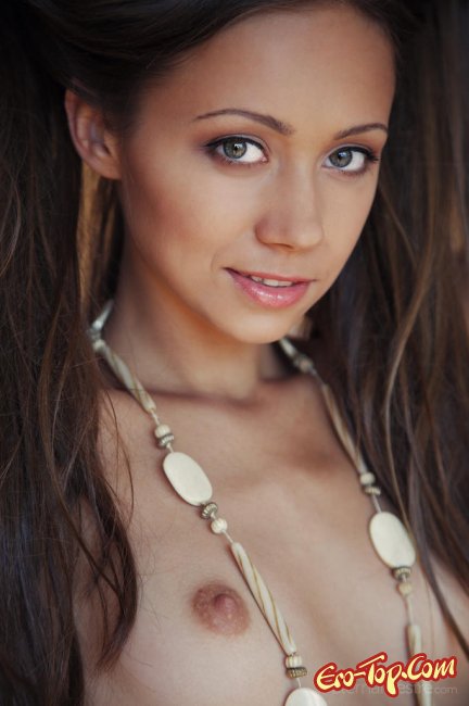 Стройная голая девушка с длинными волосами эротично позирует в спальне, стоя на высоких каблуках. Худая модель с маленькими дойками ложится на кроватку и широко раздвигает тонкие ножки, показывая бритую писю с раскрытыми половыми губками.