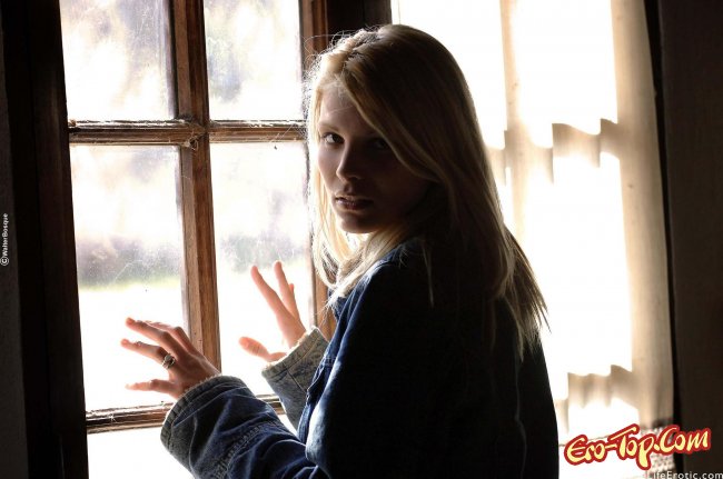 Соблазнительная блондинка с длинными волосами решила показать свои голые сиськи. Она стоит у окна и распахивает джинсовую теплую куртку, чтоб хорошо было видно ее упругие дойки. телка стоит в полный рост и можно увидеть ее узенькую писю с немного волосатым лобком.
