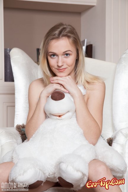 Красивая голая блондинка сидит в кресле с мягкой белой игрушкой и мило улыбается, прикрывая свои прелести. Потом девочка встает и снимает с себя розовые трусики. Сучка с голыми сиськами показывает нам свою маленькую попку, повернувшись спиной, а потом усаживается в мягкое кресло и расставляет стройные ножки.