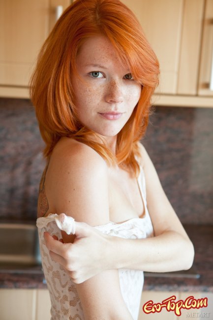 Симпатичная конопатая девушка с ярко-рыжими волосами сексуально позирует на кухне. Молоденькая соска изображает из себя соблазнительную домохозяйку. Она разделась догола, залезла на стол и стала показывать небольшие груди вместе с гладкой бритой писей.