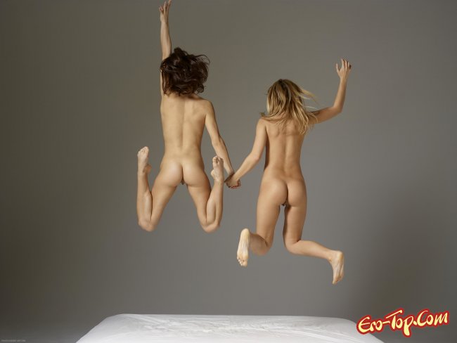 Эротика » Молодые девушки » Две голые девушки обнимаются и прыгают на постели
