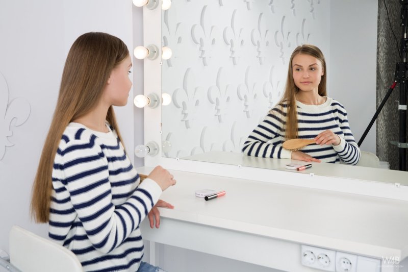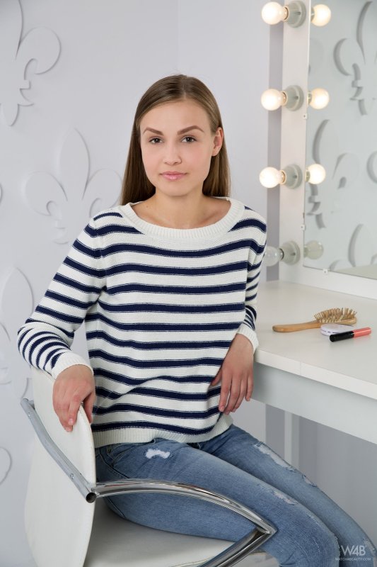 Устроившись рядом с зеркалом, в гримерке, привлекательная модель со стройной фигурой, одетая в джинсы и кофточку, начинает медленно раздеваться догола, в процессе как можно возбуждающе стягивая трусики. В обнаженном виде обворожительная крошка показывает маленькие сиськи, параллельно сжимая их руками, а так же демонстрирует гладко выбитую киску.