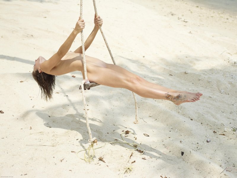 Устроившись на качели у моря, тощая и при этом довольно сексуальная девушка без одежды качается и грациозно выгибает спинку, откидывая голову назад. Наслаждаясь процессом, голая худышка с упругими натуральными сиськами с особым усердием демонстрировала свою сочную киску с нежнейшими половыми губами.