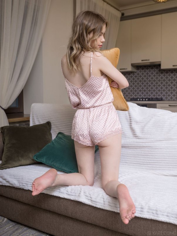 Интригующе стянув с себя перед камерой короткую шелковую пижаму и засветив под ней свои маленькие сиськи, возбужденная молодая любовница развалилась голышом на диване с широко раздвинутыми ногами и ласкает свою сочную бритую пизду, теребя пальцами розовые половые губки и глубоко трахая себя в мокрую жадную дырку.