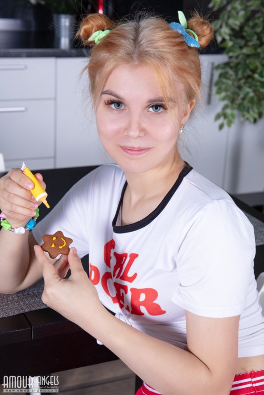Готовя на кухне миленькие сладости, игривая молодая блондиночка засвечивает белые трусики под короткой юбкой и кокетливо засвечивает под ними свою голую писечку. Выставив на показ стройное обнаженное тело, нежная детка с упругими титечками залезает прямо на стол и приглашает любого желающего опробовать ее сладкую щелку между ног.