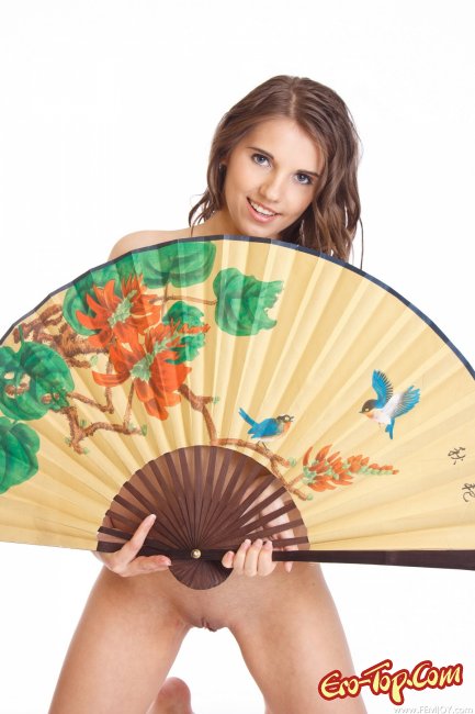 Молодая и сексуальная девочка снимает чёрный пеньюар и оказывается перед нами совсем голая, выставляя на показ свою маленькую грудь, чисто бритую письку и юное упругое тело. В руках у красотки то и дело появляется веер, а на лице едва уловимая улыбка. У девушки так же очень аппетитная попка с подтянутыми ягодицами и плоский животик с пирсингом в пупке.