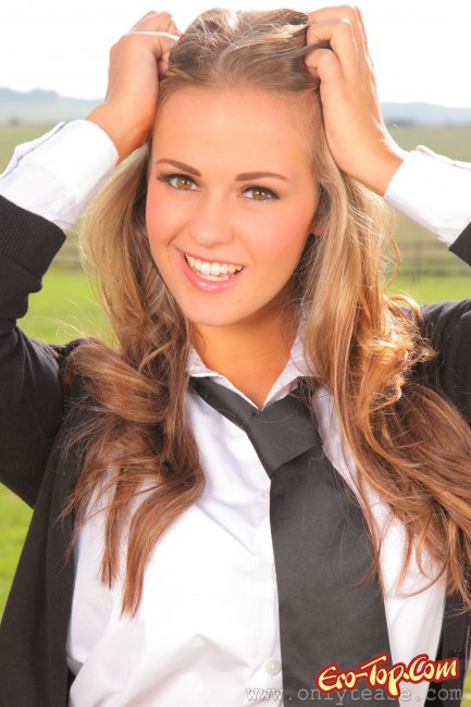 Великолепная девушка эротично позирует на природе в школьной форме. На ее красивых ножках надеты черные чулки, а на сексуальной попке коротенькая юбка красного цвета в клеточку. Блондинка с карими глазками усаживается на колодце и начинает раздеваться. Сперва она снимает лифчик и красуется большими сиськами, а потом куколка раздевается до белых кружевных трусиков.