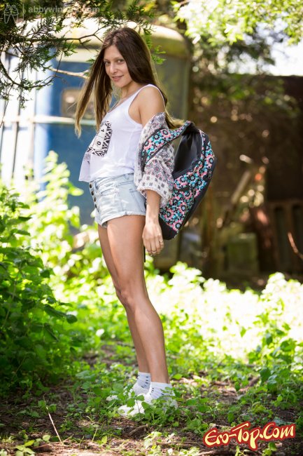 Молодая и симпатичная девка раздевается до гола в каком-то парке или дворе, не понятно, но вокруг куча зелени. Милашка снимает рюкзак, рубашку, маячку, джинсовые короткие шортики и трусики, оказываясь совершенно голой девушка без скромности демонстрирует нам своё стройное тело с небольшой грудью и красивой миниатюрной попкой, ну и конечно письку девушка покажет, она у неё тоже очень хороша...