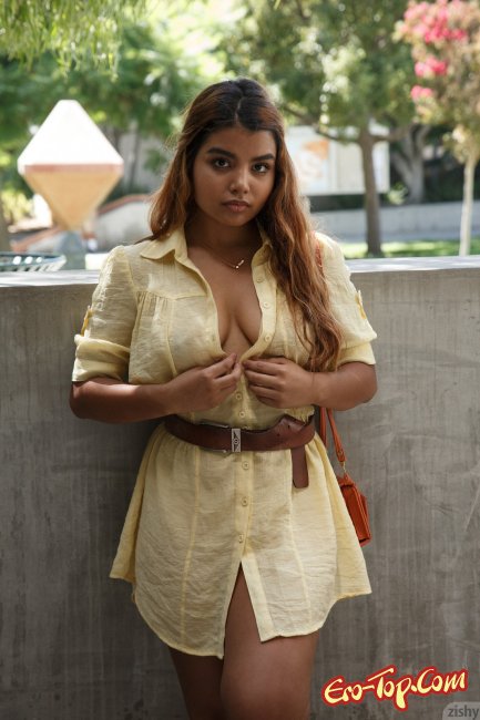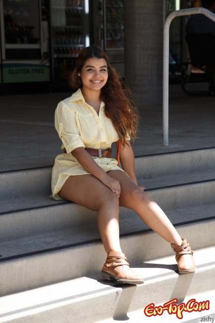 Симпатичная мулатка с пышной внешностью решила прогуляться по городу и в некоторых местах показать попку. Девушке нравилось поднимать платье и светить трусиками. В какой-то момент ей удалось отыскать здание в котором можно было попозировать раком и даже расставить ноги.