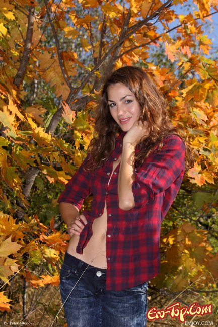 Выйдя на прогулку в лес, привлекательная девушка в красной клетчатой рубашке решила спрятаться в кустах и раздеться, продемонстрировав свое сексуальное тело перед фотокамерой в руках друга. Вначале она засветила натуральную грудь, а после встав раком и стянув трусики показала гладко выбритую письку.