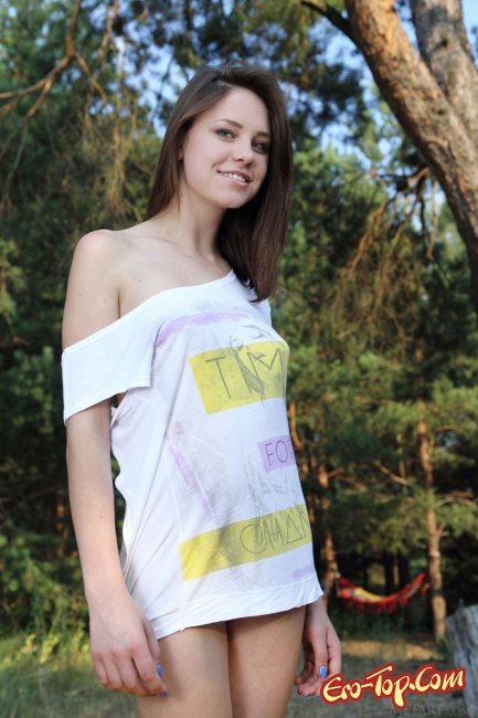 Сексуальная девушка с красивой попкой, оказавшись в лесу, решила незамедлительно раздеться, желая максимально подробно засветить ягодицы и бритую письку. В обнаженном виде красавица с натуральными сиськами средних размеров улеглась на подстилку, где и продолжила грациозно позировать, в процессе раздвигая стройные ножки.