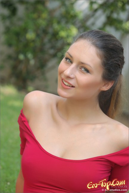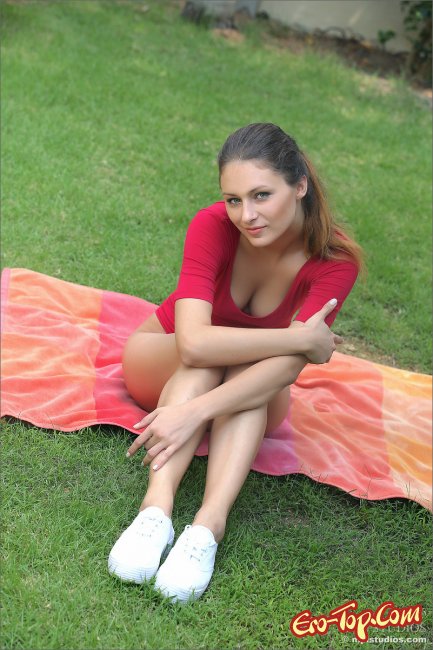 Натянув красное боди, красивая девушка начала эротично позировать и раздеваться на подстриженном газоне, в процессе грациозно прогибаясь раком на подстилке. Чередуя позы, крошка страстно сжимает натуральную грудь руками, а так же поворачиваясь упругой попочкой засвечивает гладенькую сексуальную письку с полосочкой волосиков на лобке.