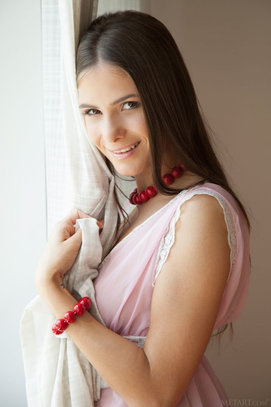 Находясь в спальне, милашка с подкаченной попочкой в будущем устраивается на кровати и медленно снимает с себя пеньюар, параллельно улыбаясь и поглаживая себя руками. Таким образом в обнаженном виде сексуальной девушке удалось так же засветить бритую письку и маленькие сиськи.
