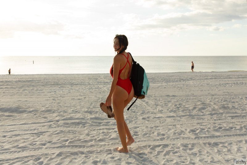 Нарядившись в цельный красный купальник, девица с шикарной попой начинает эротично гулять и позировать на пляже, в процессе валяясь на песке. Наслаждаясь летним днем, сексуальная красотка чаще всего прогибалась раком и ложилась на животик, оттопыривая измазанные ягодицы.