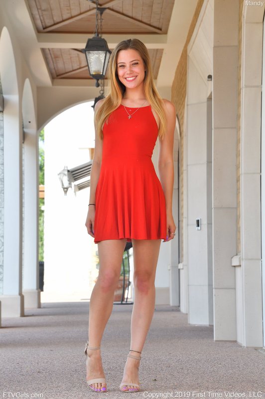 Прогуливаясь рядом с домом, возбужденная миловидная девушка в коротком красном платье порой грациозно нагибалась раком и засвечивала сочную попу с подкаченными ягодицами. Улыбаясь и ощущая удовольствие, сексуальная красотка так же немного демонстрировала бритую письку.