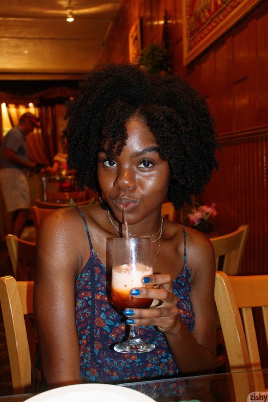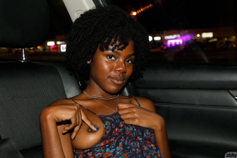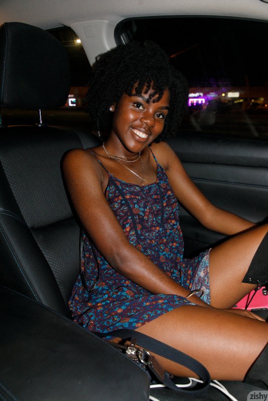 Симпатичная негритянка в коротком платье и трусиках гуляет тёплым вечером на улице, где она показала нам свою красивую упругую попку под юбкой, лихо задрав её подол. Испытывая от всего этого приятное возбуждение, чернокожая девушка забралась в машину и стянув нижнее бельё открывает нашему взору коричневую письку.
