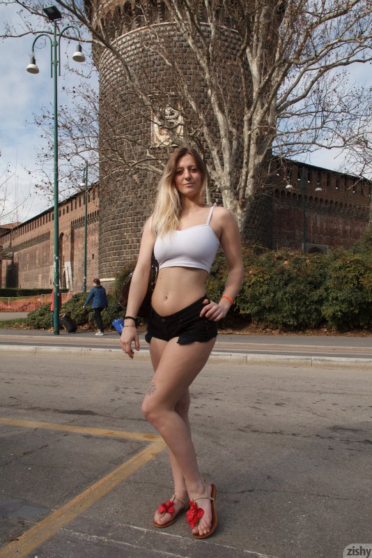 Симпатичная и весьма сексуальная дамочка с широкими бедрами и крашенными светлыми волосами эротично прогуливается на улице и периодически задирает свою длинную юбку. Поддаваясь своему игривому настроению, модель порой засвечивала натуральные сиськи и бритую письку с пухлыми половыми губками.