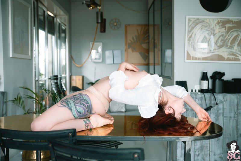 Валяясь на столе и меняя максимально возбуждающие ракурсы, красотка с татуировками особенно часто оттопыривала сексуальную жопу одетую в трусики. Послушно исполняя все просьбы профессионального фотографа, уже весьма заведенная девушка порой намеревалась стянуть с себя блузку, немного обнажая маленькие сиськи.