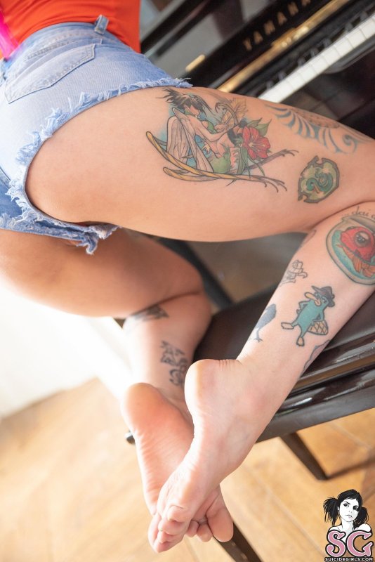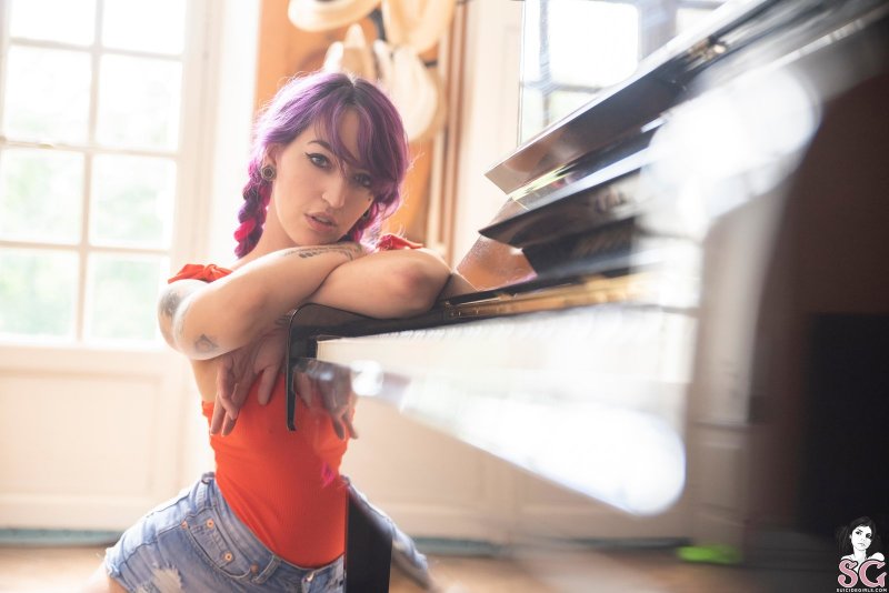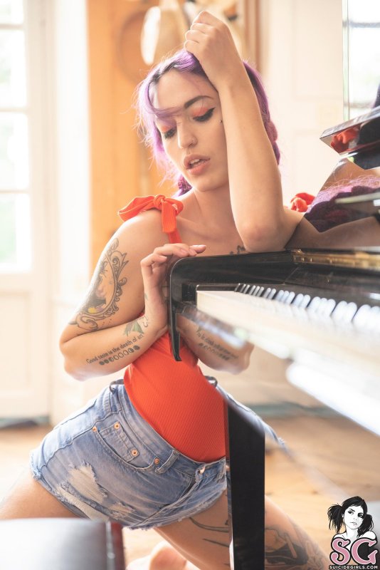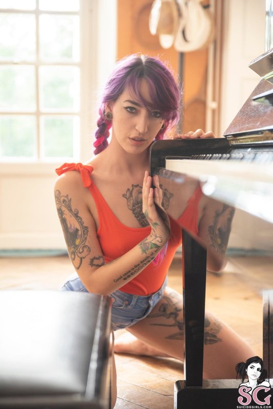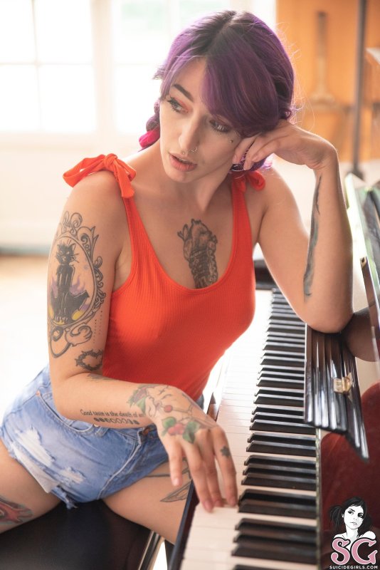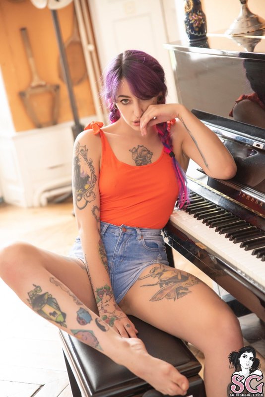 Устроившись дома у пианино, разноцветная развратная телка с татуировками медленно и соблазнительно стягивает с себя все свои шмотки, оголяя свое худое тело с маленькими титьками. Горячая девка завлекательно хвастается своим новым пирсингом - маленькими сережками в своих острых розовых сосках.