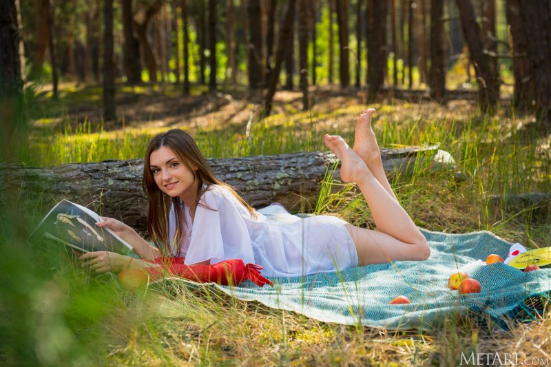 Обнаженная шатенка на пикнике в лесу