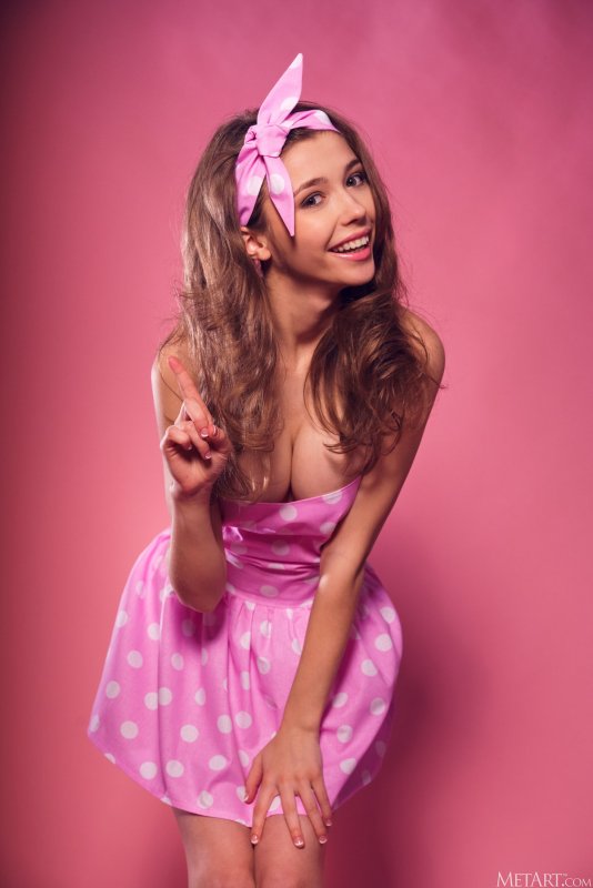 Профессионально позируя на розовом фоне, гламурная игривая шалунья соблазнительно стянула с себя короткое милое платье с прозрачными трусами и демонстративно показала свою сочную большую грудь. Обнаженная девица с шикарными формами расслабленно ложится на пол и чувственно изгибается всем телом на камеру.