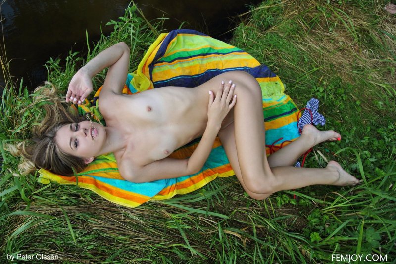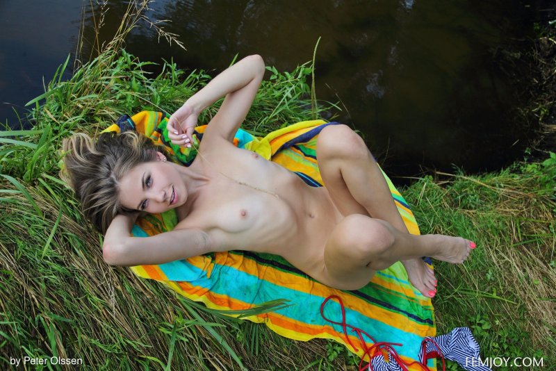 Отдыхая на берегу речки, молодая детка игриво сняла с себя откровенное бикини и весело купается голышом в теплой воде. Вдоволь накупавшись и устав, голая мокрая девушка с маленькими титьками расслабленно ложится на траву и бесстыже выставила на показ свое стройное нежное тело с упругой попкой и бритой киской.