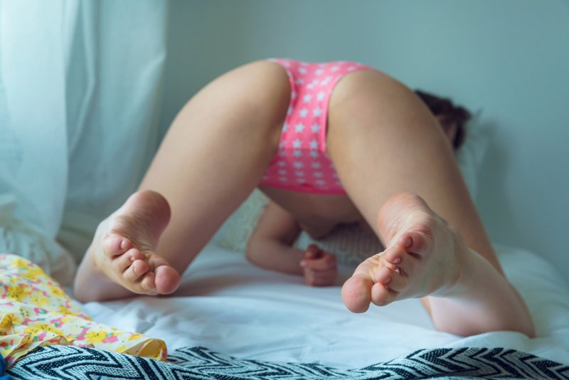 Забравшись на свою кроватку, молодая девица с брекетами игриво задирает перед камерой короткую юбку и медленно снимает розовые трусики. Медленно раздевшись до гола, аппетитная детка с натуральными титьками развратно встает в позу раком и, чувственно прогибаясь в спине, выпячивает мягкую попку и бритую пухлую киску.