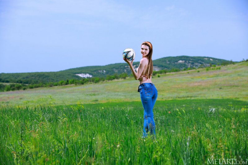 На свежем воздухе на зеленой сочной травке молодая активная девица с голыми упругими титьками весело играется с мячом. Потом бесстыжая куколка со стройным подтянутым телом постепенно стянула с себя обтягивающие джинсы и полностью оголила перед камерой не только свою аппетитную попку, но и засветила крупным планом бритую пизду с мясистыми половыми губами.
