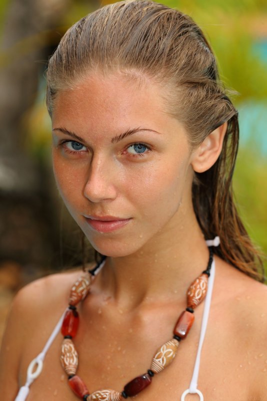 Медленно выйдя из приятной прохладной воды, стройная мокрая девица в бикини возбуждающе позирует у бассейна и постепенно оголяет свои аппетитные прелести. Выставляя на показ свои упругие сиськи и красивую попочку, голая детка раздвигает перед камерой длинные ноги и крупным планом выпячивает бритую сладкую киску с прической на лобке.