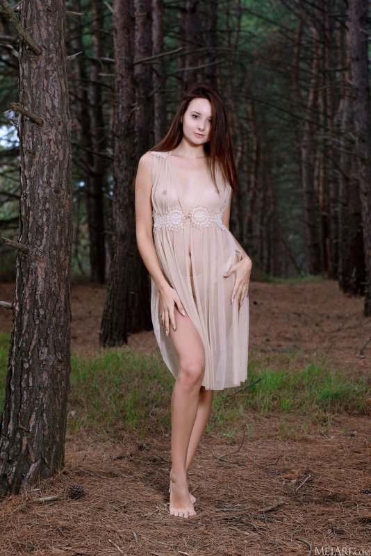 Эротично позируя на природе и возбуждающе засвечивая свои миниатюрные прелести на камеру, молодая красивая девушка в прозрачном пеньюаре постепенно оголяет сове стройное соблазнительное тело и, лежа на земле с широко раздвинутыми ножками, похотливо выпячивает вперед свою бритую нежную писечку.