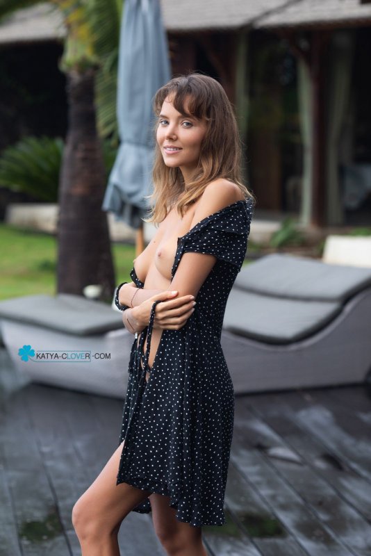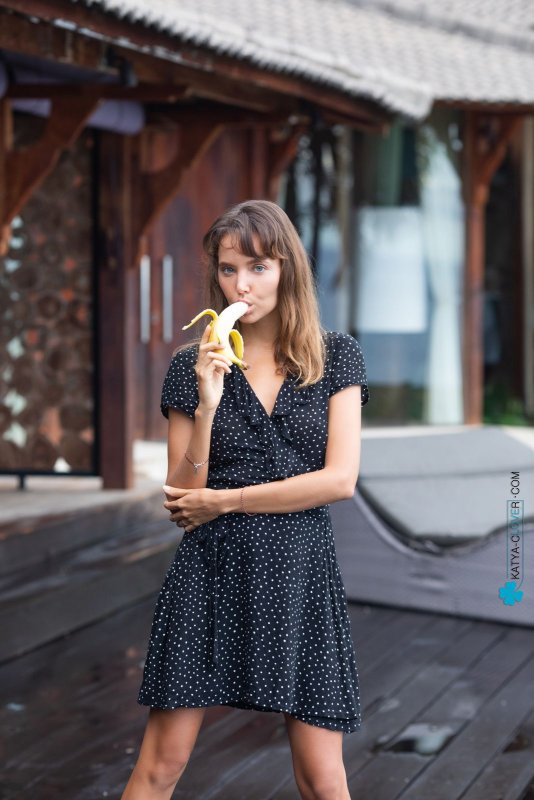 Эротично облизывая и посасывая спелый длинный банан, сексуальная кокетливая дамочка в платье решительно распахнула его перед камерой и оголила свои натуральные прелести. Раздевшись до гола, загорелая чертовка с красивую упругой попочкой тут же принялась позировать всем телом у большого бассейна и с самых возбуждающих ракурсов засвечивать свою бритую пухлую киску между ног.