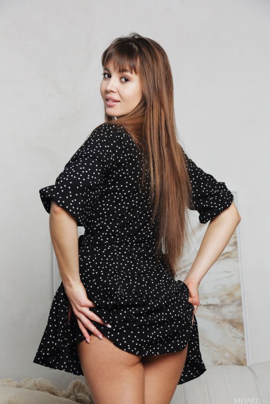 Соблазнительно медленно избавившись от короткого платья, развратная дамочка выставила на всеобщее обозрение свои натуральные мягкие титьки и вовсю светит на камеру своей бритой розовой киской, страстно извиваясь всем телом на диване в разных позах и крупным планом выпячивая вперед голую задницу с манящими дырками между ног.