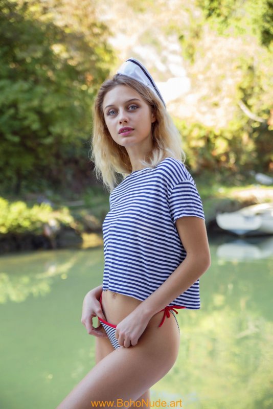 Игриво позируя перед камерой на берегу моря, молодая развратная морячка с маленькой упругой попкой с удовольствием разделась до гола и выставила на показ свое стройное тело с плоскими титечками. Затем бесстыжая девица разлеглась на надувном круге с широко раздвинутыми ногами и во всей красе демонстрирует нам свою бритую раскрытую промежность.