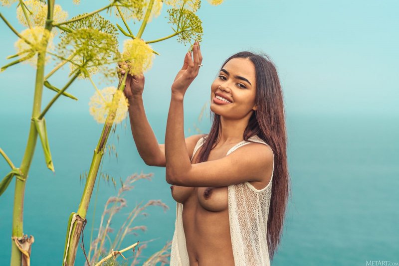 Открыто демонстрируя на камеру свои натуральные прелести, улыбчивая смуглянка с голыми упругими сиськами и провисшей жопой эротично позирует обнаженной на природе. Чувствуя себя уверенной и безумно сексуальной, горячая мулатка сидит на травке с широко раздвинутыми ногами и бесстыже светит своей бритой писькой.