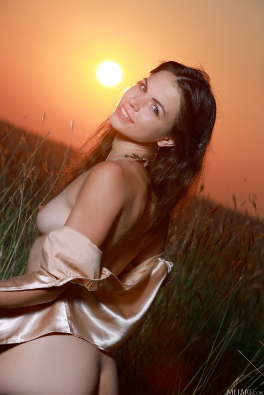 Страстно и нетерпеливо сорвав с себя всю одежду и красиво позируя всем телом на фоне заката, молодая игривая девица с миниатюрными сисечками и острыми сосками без стеснения хвастается перед камерой своими голыми прелестями на природе и с разных невероятных ракурсов показывает нам свои самые интимные места.