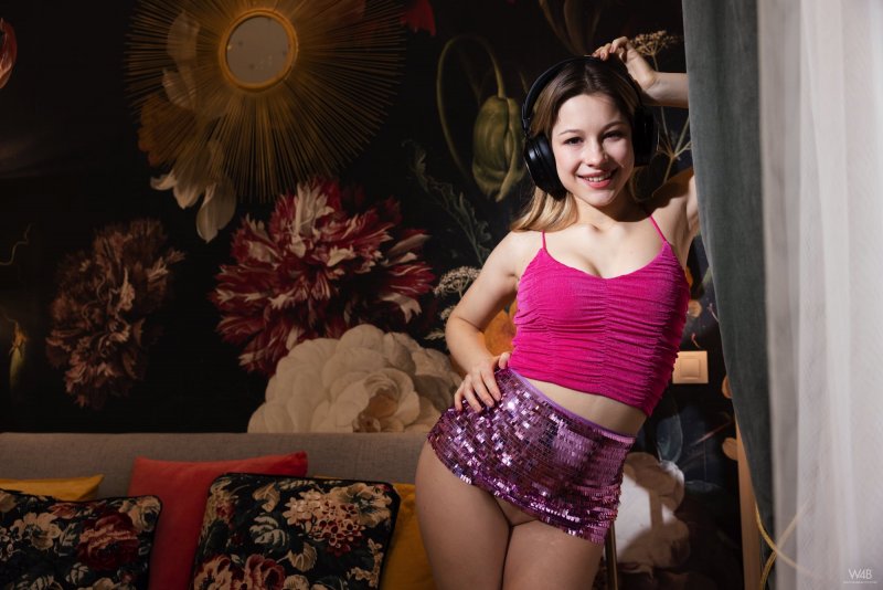Позируя перед камерой в яркой розовой одежде и развязно устроившись на диване с высоко задранной юбкой, развратная чикса без трусов широко раздвигает ноги и вовсю светит своей голой бритой писькой, а затем выставляет на показ из-под майки сочные сиськи и начинает бесстыже трясти ими перед камерой.