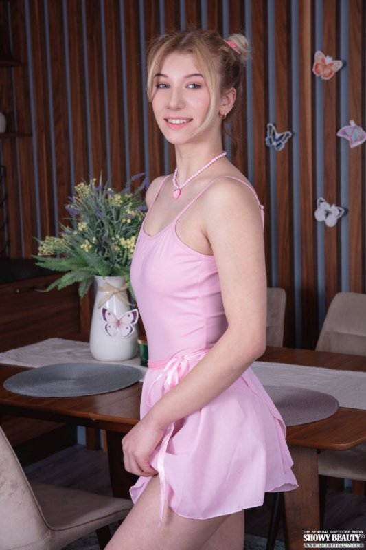 Кокетливо прогибаясь всем телом в разных эротических позах и одновременно снимая свой розовый наряд, худенькая балерина с натуральными титями оголила перед камерой упругую попку и, развратно выпячивая ее с соблазнительно раздвинутыми ногами, показывает нам свою бритую пиздёнку.
