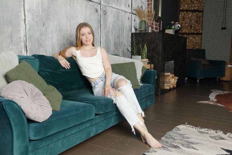 Изящно и неторопливо извиваясь перед камерой, аппетитная куколка с натуральными титьками игриво стягивает джинсы с упругой попы, а затем удобно ложится на диван с широко раскрытой рогаткой и сразу же принимается теребить пальчиками свою бритую розовую пизду с сочной начинкой.