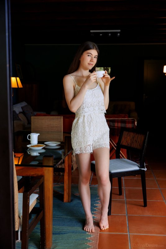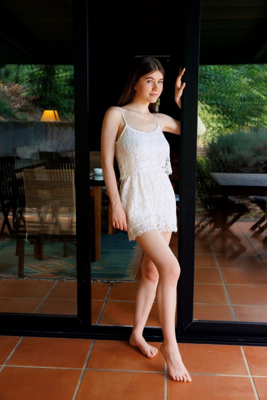 Наслаждаясь всеобщим вниманием и наслаждаясь каждой минутой, длинноногая дылда кокетливо сняла с себя майку с шортиками и оголила свои большие натуральные дойки. Немного похваставшись большой нежной попкой, молодая девица соблазнительно покачивает бёдрами и мельком засвечивает между ними свою сжатую гладкую писю.