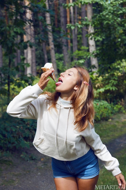 Устроив на прогулке в парке настоящий стриптиз и постепенно снимая с себя всю одежду, горячая красотка оголила перед камерой свои сочные упругие буфера и задницу, а потом эротично размазала растаявшее мороженое по всему обнаженному загорелому телу и в самых развратных позах показала на камеру бритую киску между ног.