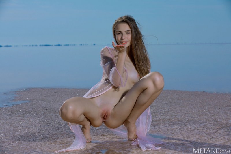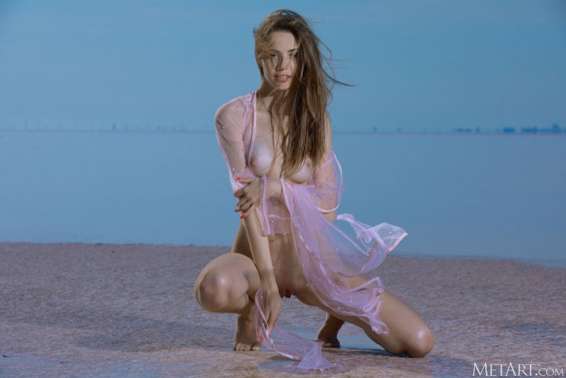 Медленно стянув с себя нижнее белье и оставшись позировать на камеру в длинном прозрачном халате, обнаженная модель с миниатюрными упругими титечками уверенно демонстрирует всем желающим свое стройное гибкое тело и бесстыже светит между длинными ножками большой розовой писькой на пляже.