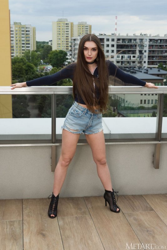 Уверенно и дерзко позируя перед камерой в своем импровизированном стриптизе, развратная сучка в кофточке и коротких шортах бесстыже оголила под ними свои натуральные сиськи и задницу на крыше, а потом принялась высоко задирать перед нами свои аппетитные ножки, засвечивая в промежности голую письку с прической на лобке.