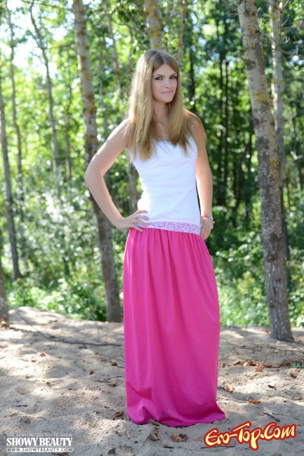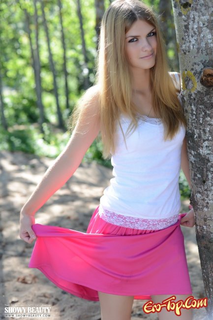 Привлекательная девушка разделась на природе, чтобы насладиться прохладным ветерком и теплыми солнечными лучами. Дело происходило на пляже, который переходил в лесную чащу, что позволяло красотке ходить по песку в обнаженном виде и не смущать, так как мало кто мог ее заметить. У молоденькой стройной модели была маленькая грудь и гладкая писька, которая выглядела достаточно соблазнительно.