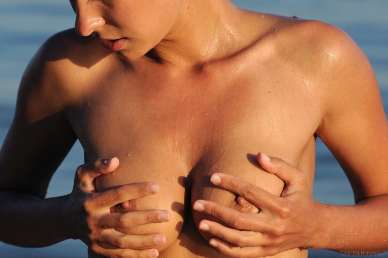 Выбравшись с моря, обнаженная мокрая стройняшка с торчащими сосками на натуральной упругой груди начинает эротично позировать на пляже, в процессе страстно трогая себя руками и ощущая удовольствие. Помимо сисек, очаровательной девушек так же удается продемонстрировать плоский животик с гладеньким лобком и бритой писькой.